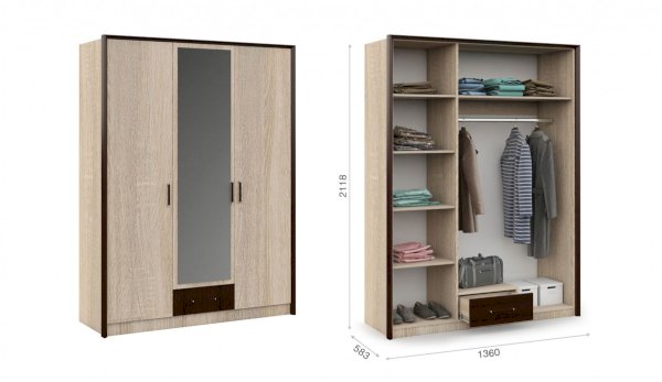 Классический распашной трехдверный шкаф с дополнительным выдвижным ящиком выполнен в стиле минимализм: строгие черты, функциональность и простота. Контрастный профиль из МДФ 22мм по внешним углам со скругленными краями – максимально безопасное использование мебели. Кромка цвета венге подчеркивает древесную текстуру и рисунок светлого дуба сонома. Зеркало на центральном фасаде делает комнату светлее и просторнее. Мебель выполнена из экологичных материалов