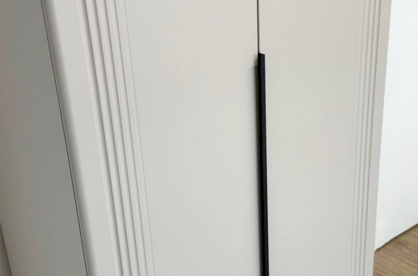 Корпус шкафа изготовлен из ЛДСП, что гарантирует прочность и долговечность. Фасады, выполненные из МДФ в плёнке ПВХ, не только выглядят эстетично, но и защищают шкаф от повреждений. Особое внимание заслуживает фрезеровка фасадов, которая придаёт шкафу изысканный вид.