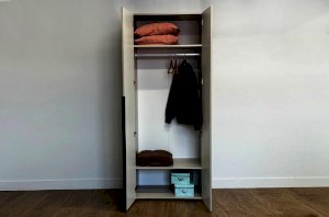 Шкаф оснащён длинными пластиковыми ручками и имеет удобное внутреннее наполнение: две большие полки и одна длинная штанга. Это позволяет рационально использовать пространство и разместить различные типы одежды.