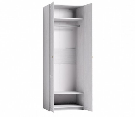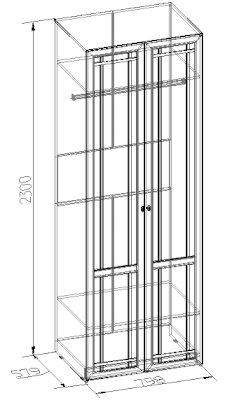 Шкаф с распашными глухими фасадами, декорированными раскладкой из профиля МДФ. Глубина шкафа в 579 мм позволяет комплектовать шкаф стационарной штангой длиной 757 мм. На ней можно разместить более 10 плечиков с верхней одеждой. Нижняя полка размещается на высоте 290 мм от нижнего щита, рационально организуя нижнее свободное пространство шкафа.