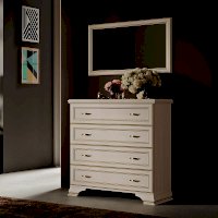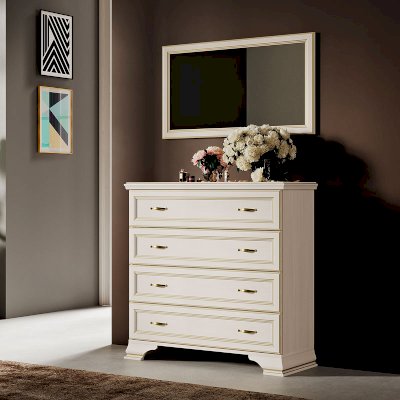 В основе изделия ЛДСП в профиле МДФ в пленке ПВХ «Бодега белый», рельеф фигурного профиля повторяет золотая патина. Светлая цветовая гамма с текстурой дерева легко сочетается практически с любым цветом стен.