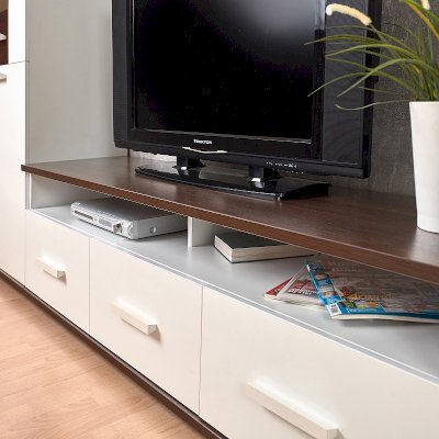 Норвуд 3 Тумба ТВ в белом минималистичном дизайне гармонично дополнит любую современную гостиную. Яркий акцент тумбы - контрастные верх и низ толщиной 22 мм в декоре Орех шоколадный. Три выдвижных ящика на шариковых направляющих плавно и бесшумно открываются за светлые ручки из массива дерева. Утопленная вглубь перегородка открытой ниши создает ощущение легкости и воздушности. На невысокой тумбе можно разместить телевизор диагональю до 65''.
