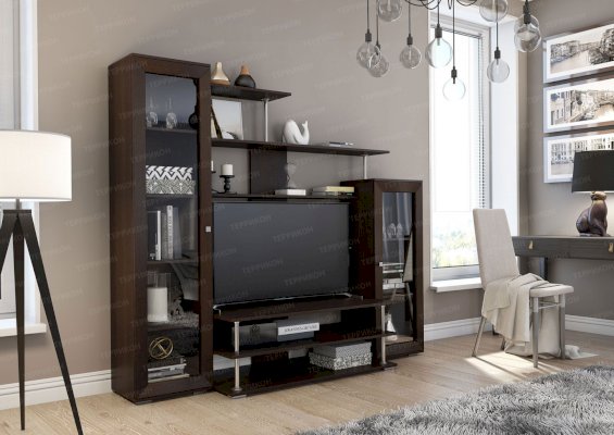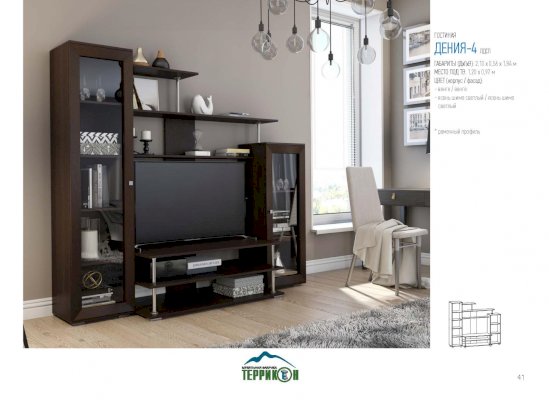 Небольшая по габаритам гостиная «Дения-4» станет гармоничным дополнением к любому интерьеру. Строгие формы и благородная расцветка в сочетании с элементами из стекла и металла смотрятся универсально. Гарнитур подходит к помещениям, оформленным в различной стилистике. Он отлично сочетается с классикой, минимализмом, техно, контемпорари и лофтом.