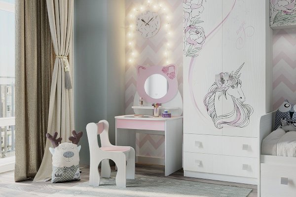 Девочки любят во всем подражать маме. Отличным подарком для Вашей дочки будет комплект-трюмо с зеркалом, полочками, выдвижным ящиком и замечательным стульчиком в едином стиле.